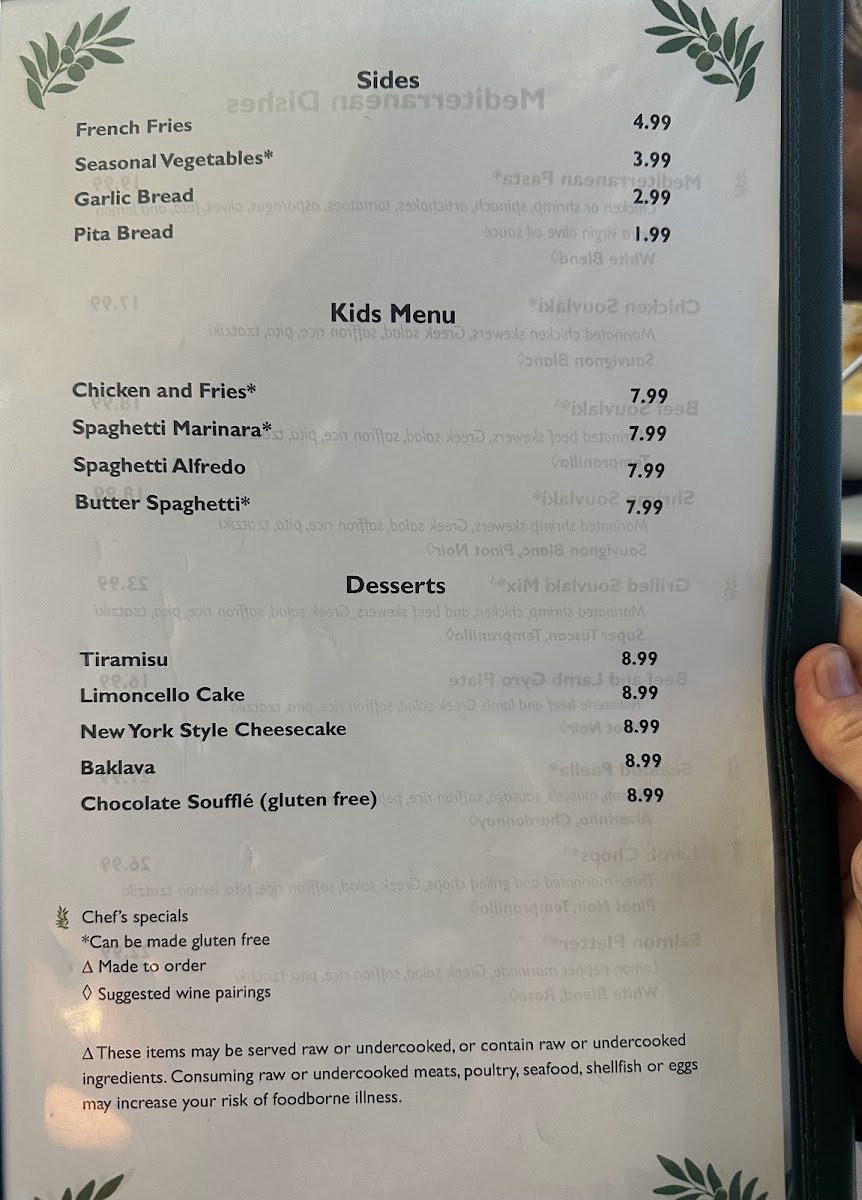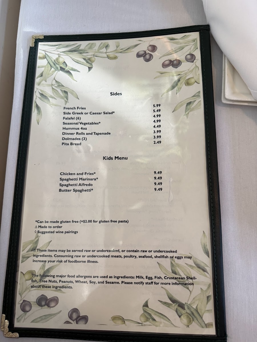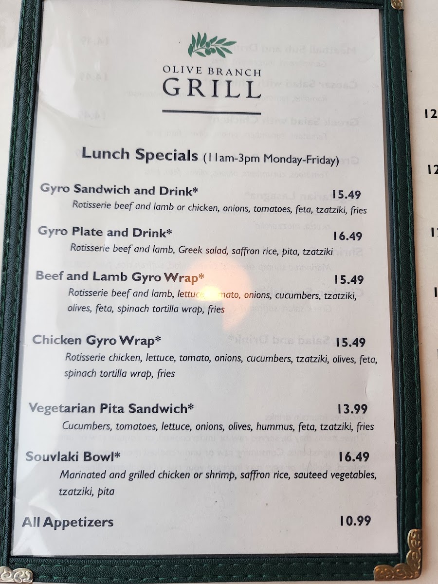 Rotisserie beef and lamb, lettuce, tomato, onions, cucumbers, tzatziki, olives, feta, spinach tortilla wrap, fries. Includes fountain drinks